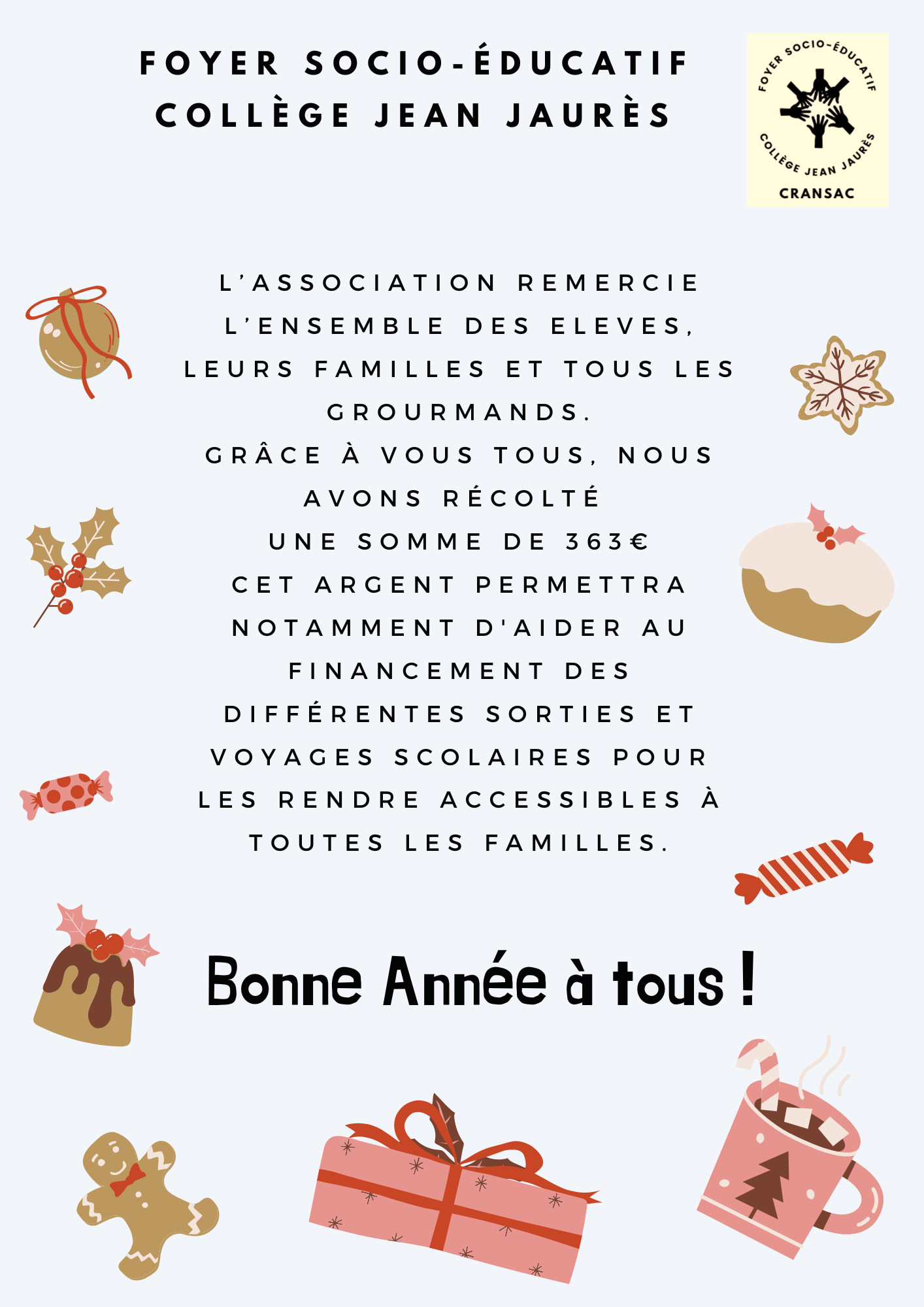 Grâce à vous tous, nous avons récolté une somme de 363€ qui permettra de financer de nombreux projets.